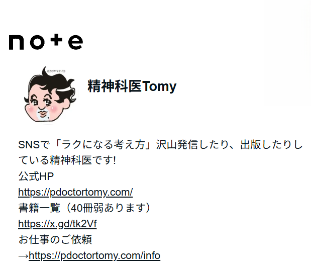 1978年生まれ。東海中学・東海高校を経て、名古屋大学医学部卒業。医師免許取得後、名古屋大学精神科医局に入局する。日本精神神経学会認定専門医。精神保健指定医。39万フォロワー突破のX(旧・Twitter)が人気で、テレビ・ラジオなどマスコミ出演多数。著書『精神科医Tomyが教える 1秒で不安が吹き飛ぶ言葉』(ダイヤモンド社)に始まる「1秒シリーズ」は、36万部突破のベストセラーとなった。『精神科医Tomyが教える 心の執着の手放し方』(ダイヤモンド社)の小説シリーズも反響を呼ぶ。『精神科医Tomyの気にしない力』(だいわ文庫)、『精神科医Tomyが教える50代を上手に生きる言葉』(ダイヤモンド社)ほか著書多数。身長189㎝ 体重86㎏。