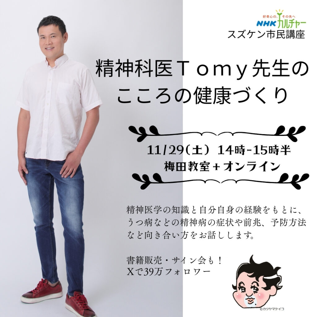 / 最終更新日時 : seishinkaitomy4347hirano イベント 11/29 スズケン市民講演会を講演しました。「精神科医Tomy先生のこころの健康づくり」大阪梅田NHK文化センターにて、精神医学の知識と僕自身の経験をもとに、うつ病などの精神病の症状や前兆、予防方法など向き合い方をお話しさせていただきました。公式LINE毎朝精神科医Tomyから朝礼メッセージが届きます。最新のイベントや新刊の情報も!フォローはコチラYoutube毎日18時に定期配信。不安や人間関係の悩みなどがラクになる!フォローはコチラVoicy毎日21時にお届けする、おやすみ前の声のサプリ。心がスッキリします。フォローはコチラX(旧Twitter)フォロワー39万人超え、一日何度も、心がラクになる魔法の言葉をつぶやいています。各種お知らせも。まずフォローするならココ。フォローはコチラInstagram週に2回程度Tomyのおちゃらけ写真や、愛する動物たちとの写真を、心がラクになる言葉と共にUPしています。フォローはコチラAmeba blog2010年から続く、精神科医Tomyの原点ブログ。Tomyはここから始まりました。フォローはコチラコメントを残す コメントをキャンセルメールアドレスが公開されることはありません。 ※ が付いている欄は必須項目ですコメント ※名前 ※ メール ※ サイト 次回のコメントで使用するためブラウザーに自分の名前、メールアドレス、サイトを保存する。